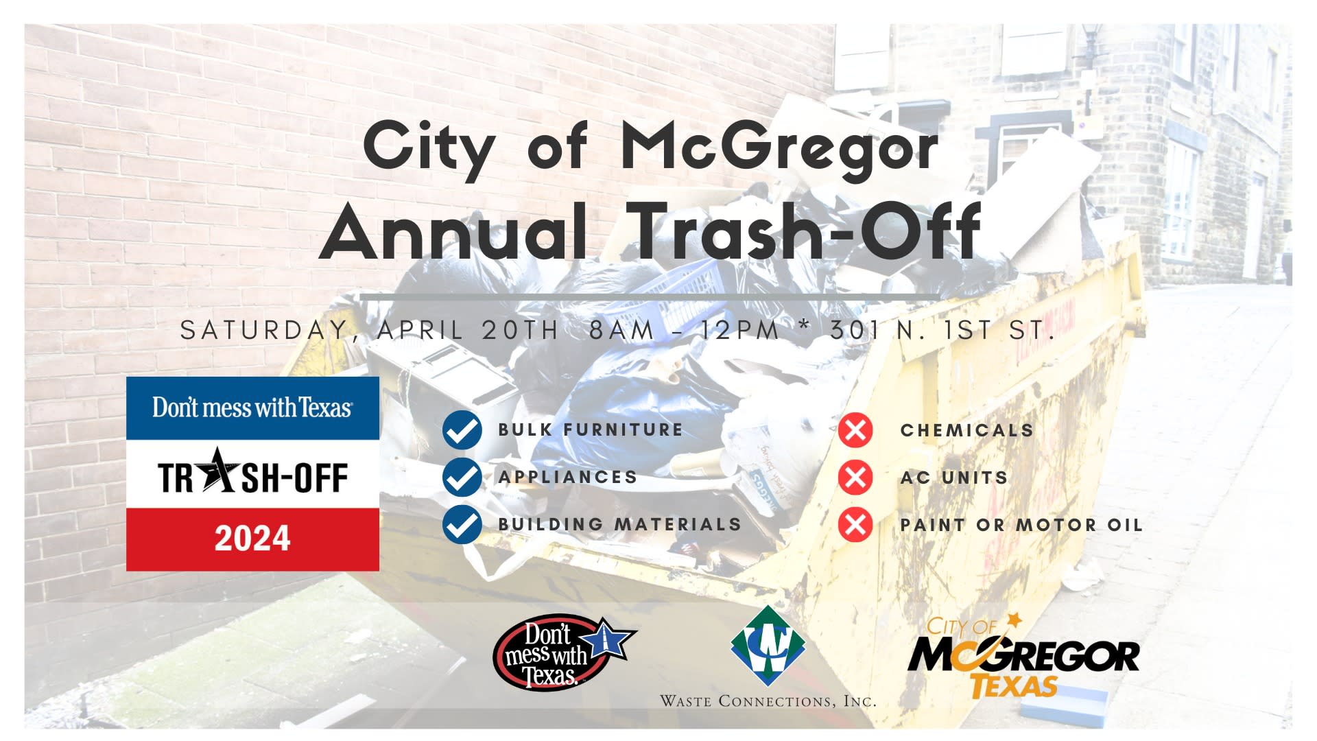 The McGregor City Trash-Off date has been set for Saturday, April 20th, 2024. You can drop your bulk furniture, appliances, building materials, tires at 301 N. 1st Street between 8am and noon.